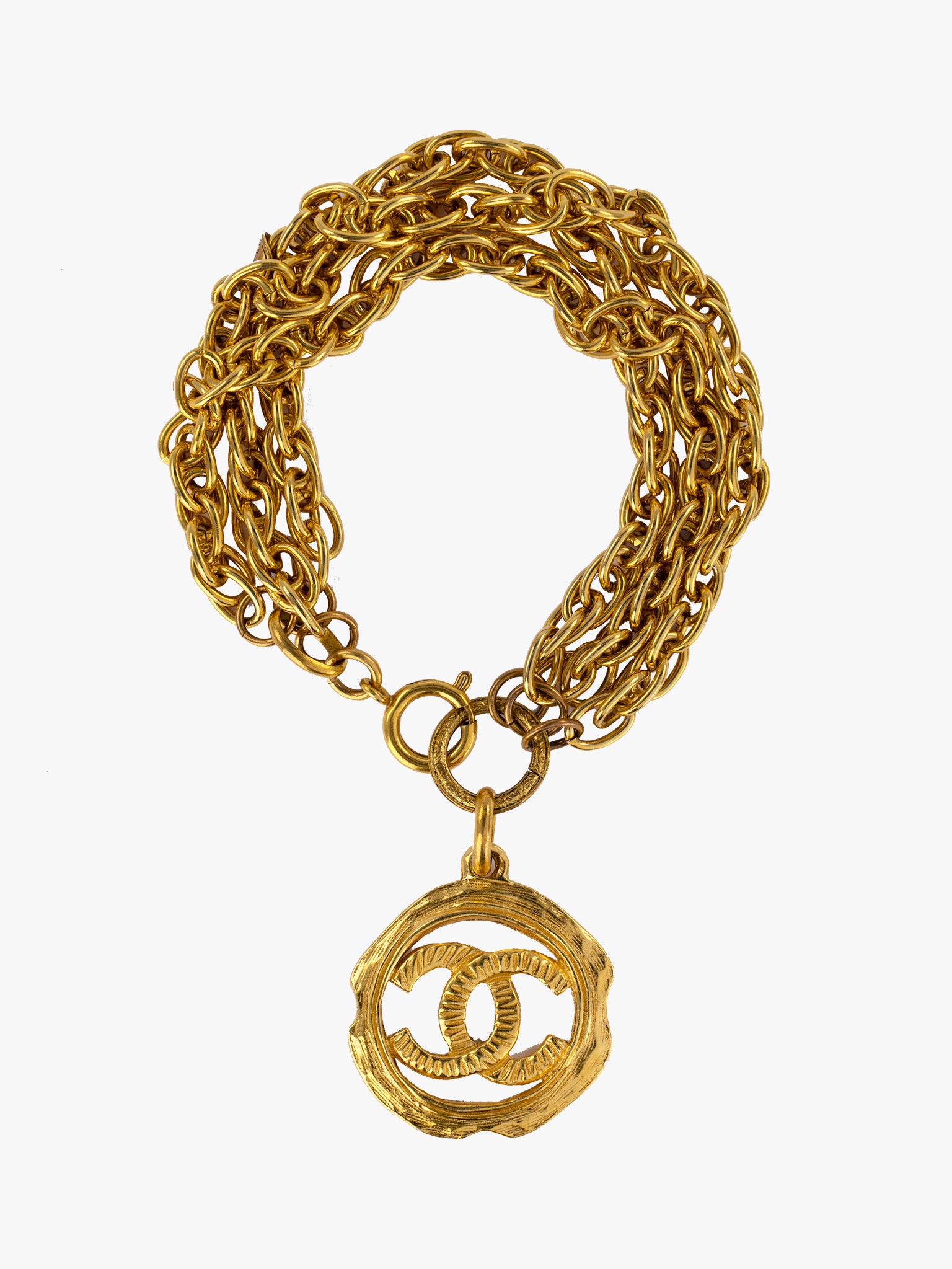 A stunning statement charm bracelet from the House of Chanel hailing from the uber glam 1980s. The large interlocking CC motif medallion dropping away from a torsade effect trio of fancy link chains. A very special piece of heritage Chanel that will prove an eternal style investment. - This style of Chanel bracelet are a loose and long fit typically worn daping down the hand when customer is an average wrist size. Charm drop 3.5cm.