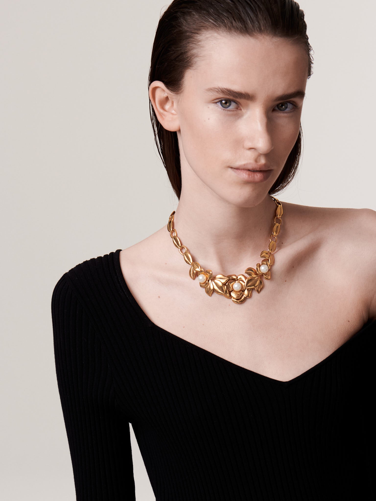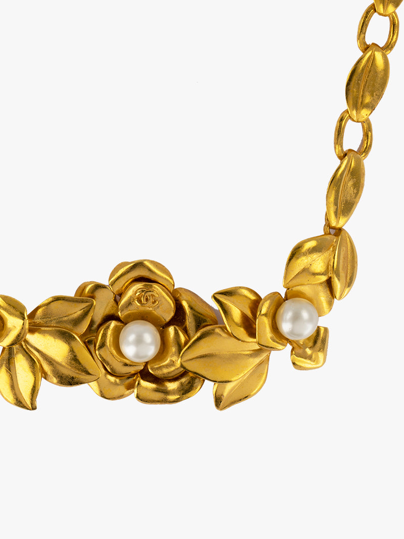 A rare and utterley captivating Chanel necklace from 1999 most likely created by Maison Goossens for Chanel. The design incorporates freeform style Camelia flowers; Coco's favourite flower, set with her trademark faux pearls. The attention to detail in the craftmanship of this piece is second to none. Perfect heritage style from the House of Chanel. 44-48cm adjustable length, 3.3cm depth at front.