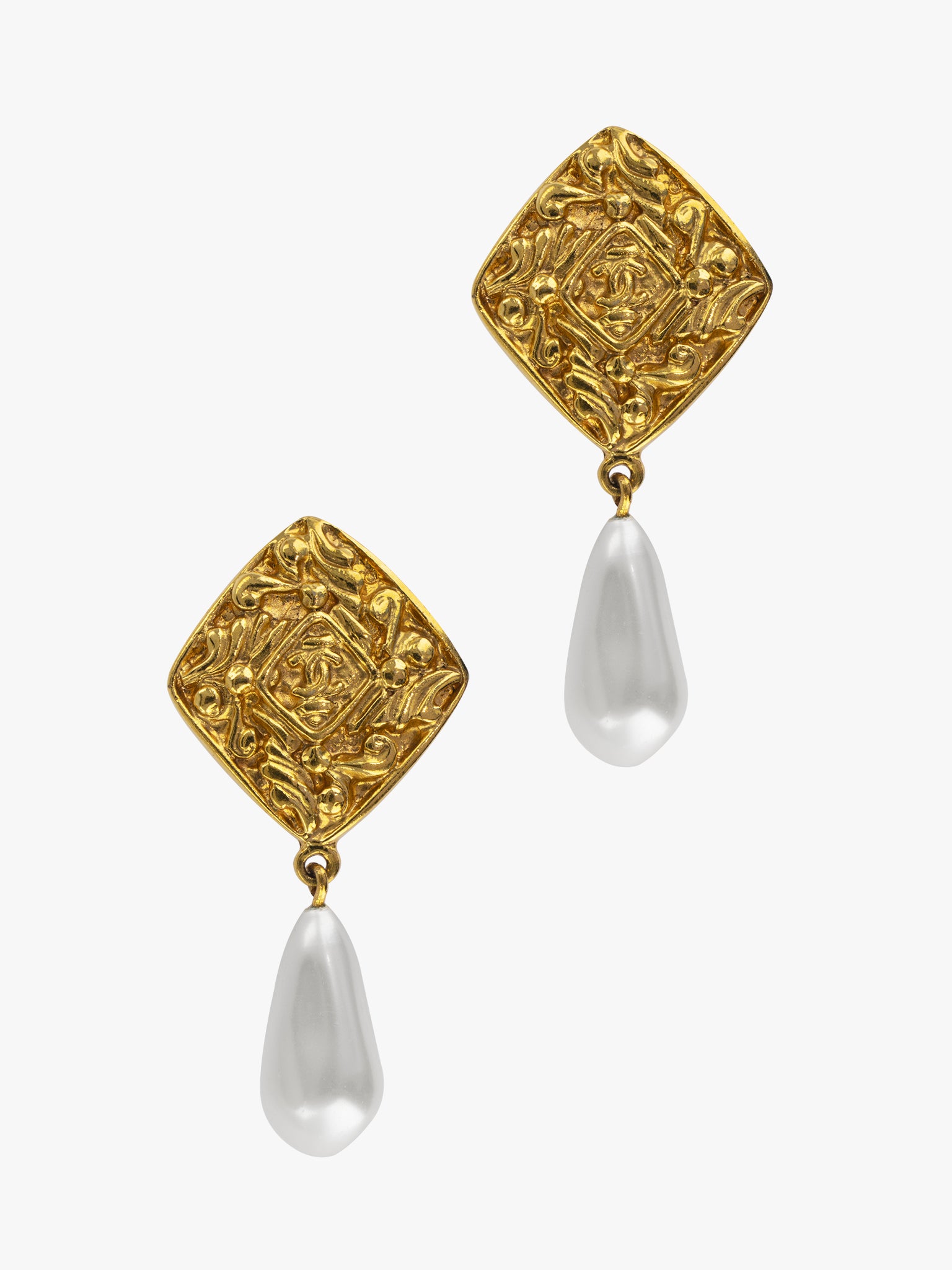 The Chanel pearl drop. The quintessential style statement that proves totally timeless and never more so than when it hails from the collections of the 1980s. The top comprising an elaborately patterned lozenge design incorporating a discrete iconic CC logo. A beautiful baroque style glass simulated pearl completes the design, dropping elegantly away and conjuring thoughts of Coco's legacy of pearls. A timeless and ultra chic heritage earring from Chanel.