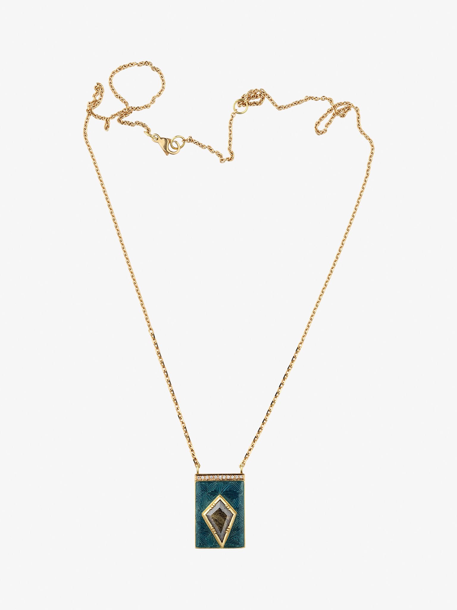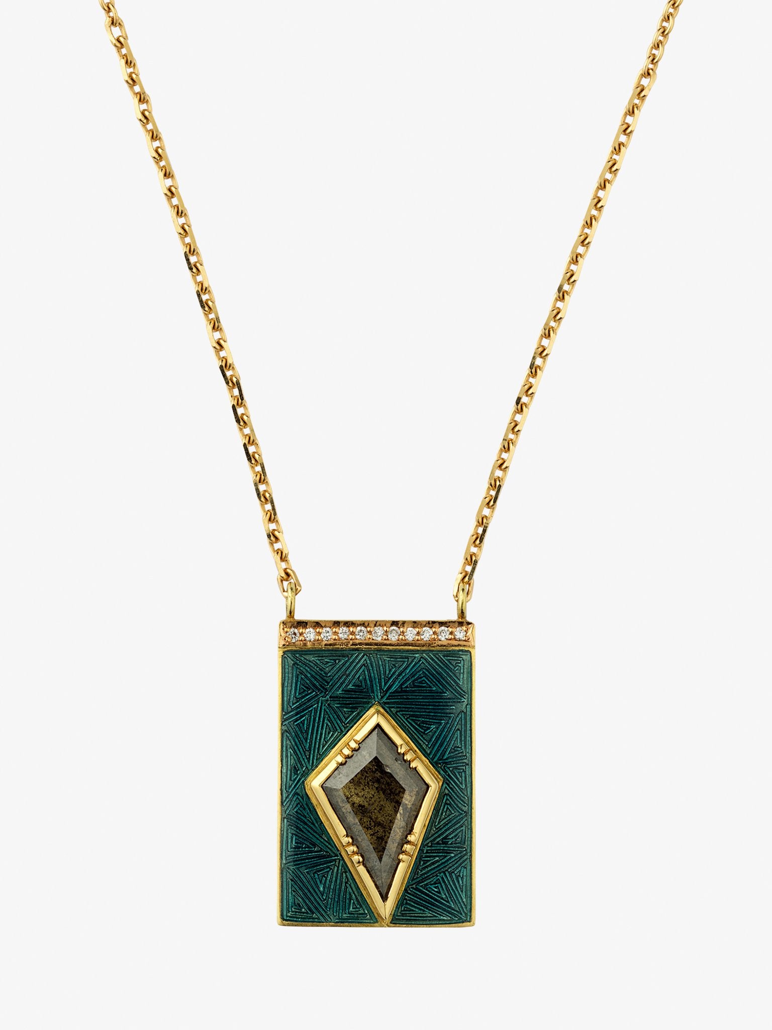 18k gold georgian bezel raw diamond pendant with white diamond pave and hand engraved and enamelled detail.