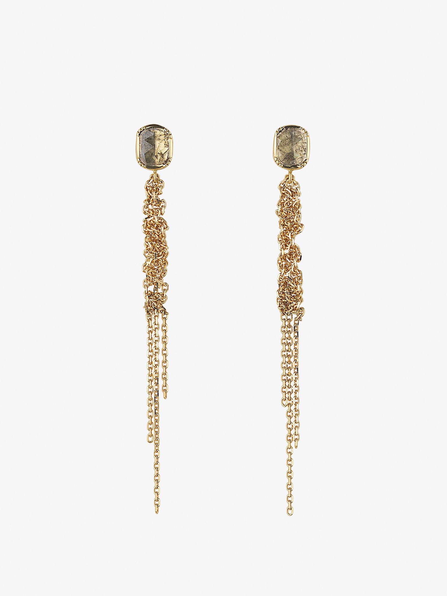 18k gold georgian bezel diamond slice earrings with hand woven 18k gold chain and ear stud closure.